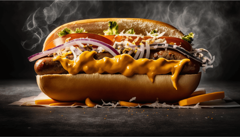 Hot dog dressed in mustard, accompanied by a side of ketchup